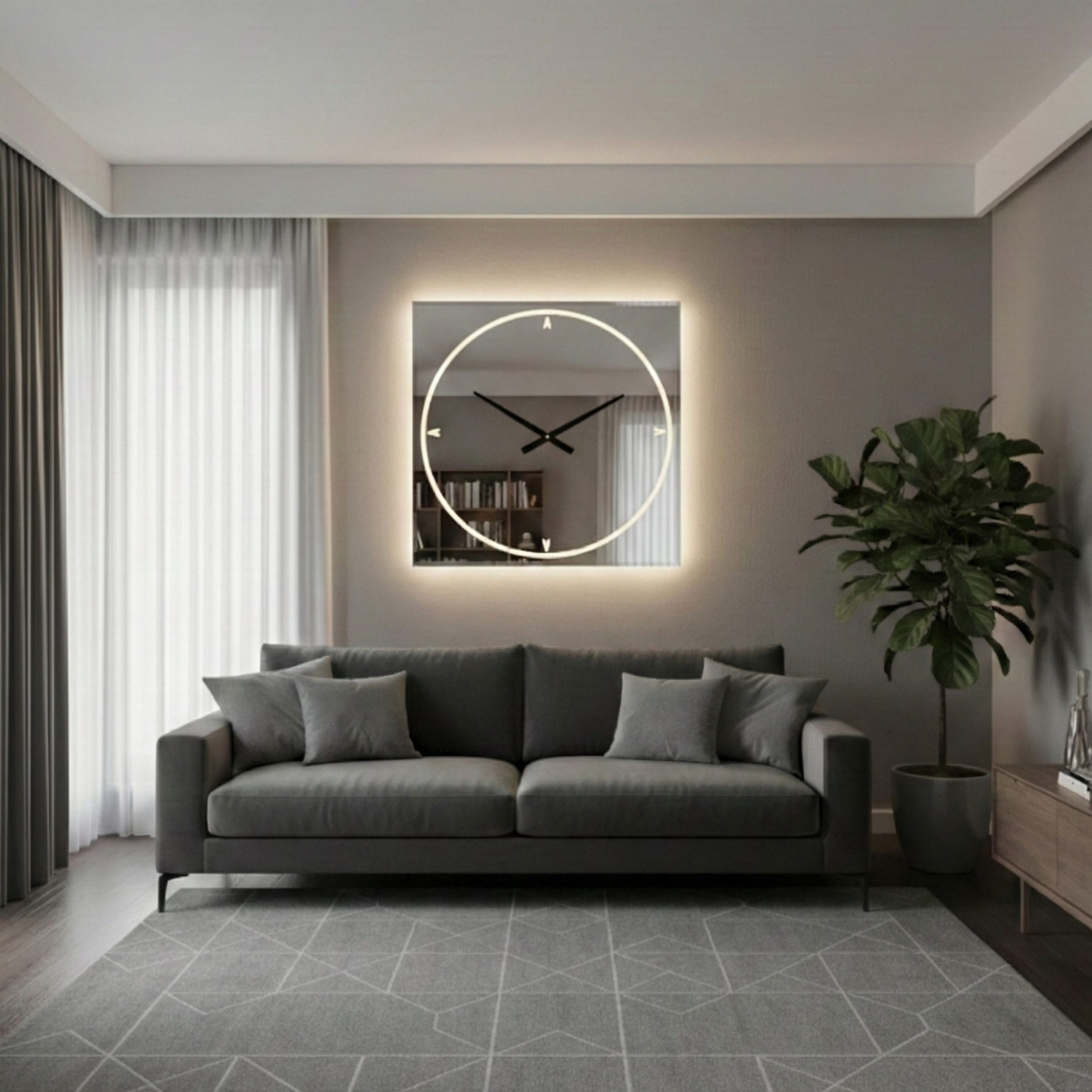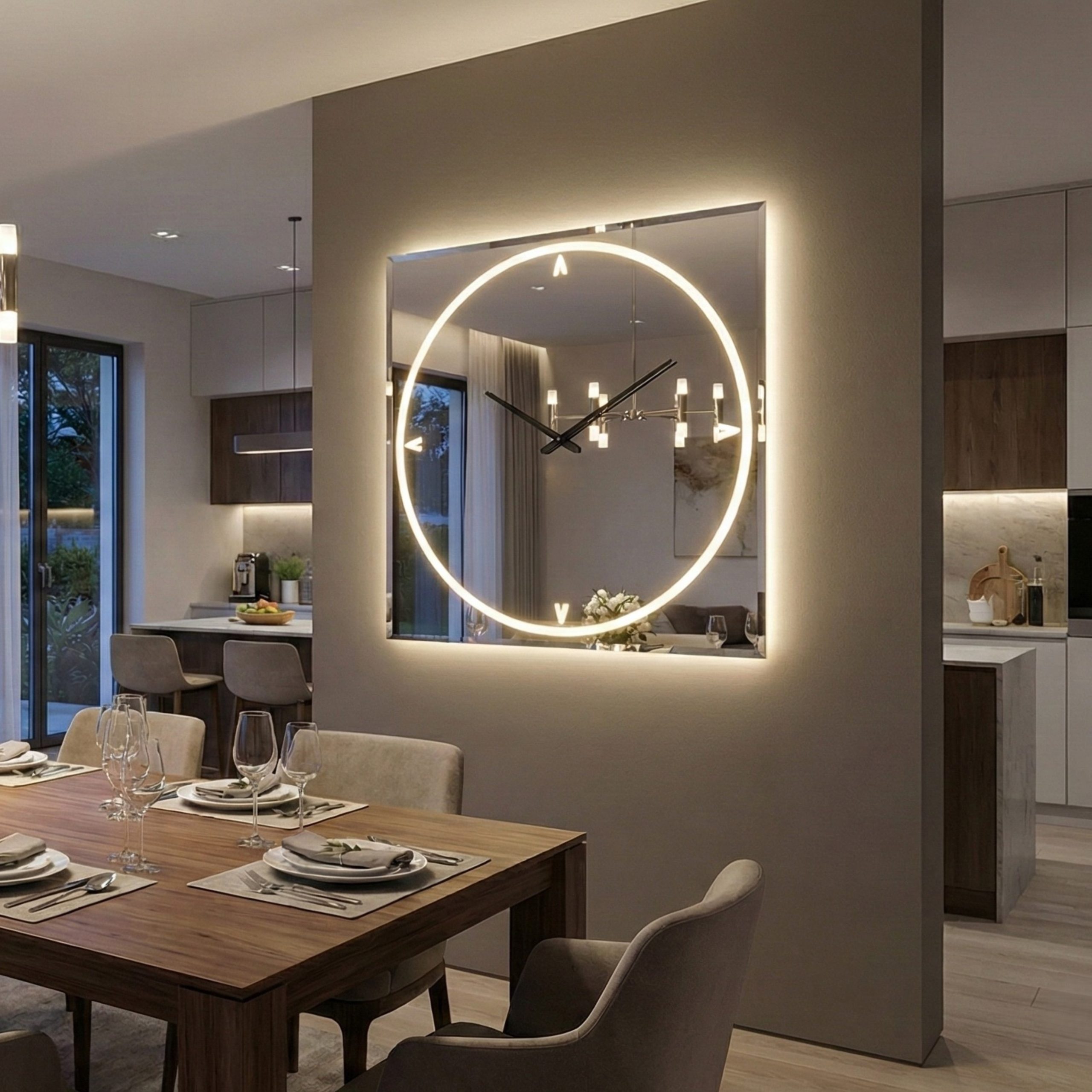 Andromeda è l’unione armoniosa di geometria e luce. La sua composizione combina la solidità della forma quadrata con la morbidezza di un segno circolare luminoso che attraversa la superficie dello specchio, creando un equilibrio visivo elegante e contemporaneo. Il contrasto tra le due forme geometriche genera una composizione dinamica. La luce LED integrata è progettata per essere morbida e avvolgente, capace di valorizzare l’ambiente senza risultare invasiva. Grazie alla sua estetica pulita e contemporanea, Andromeda si inserisce facilmente in ambienti moderni dove diventa un elemento centrale della parete: sopra una madia, in una zona living, in una sala da pranzo o in spazi dedicati all’accoglienza.
