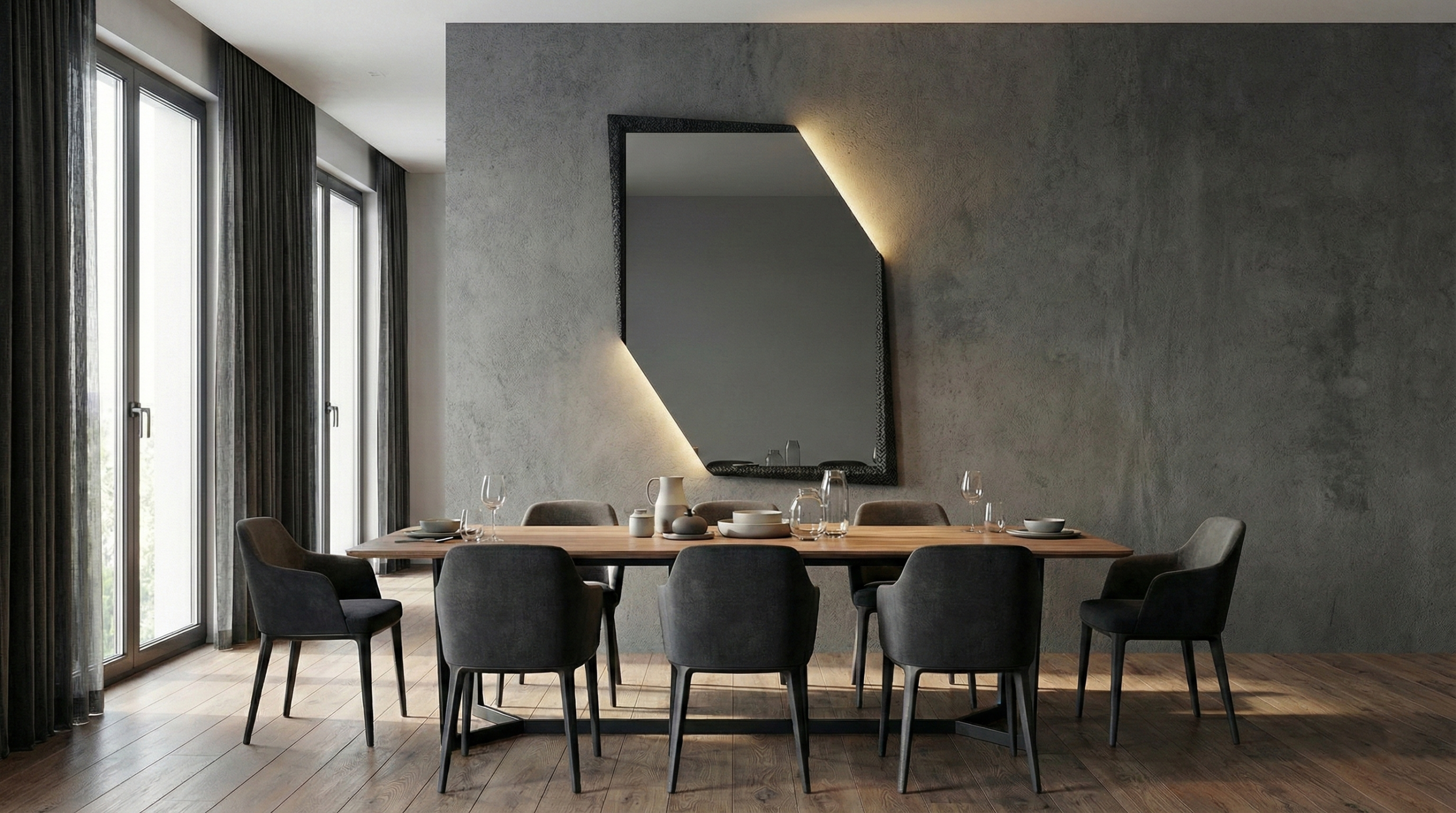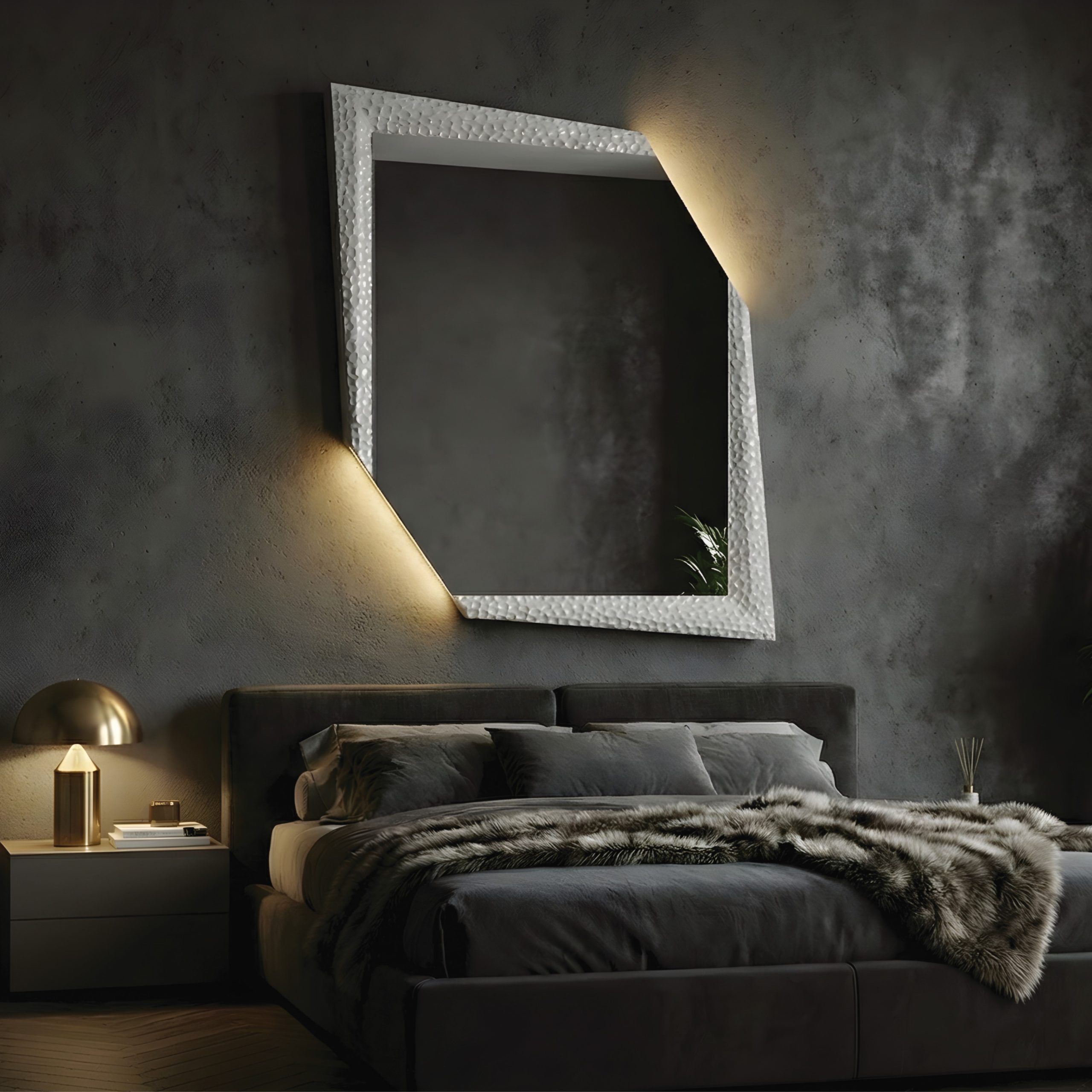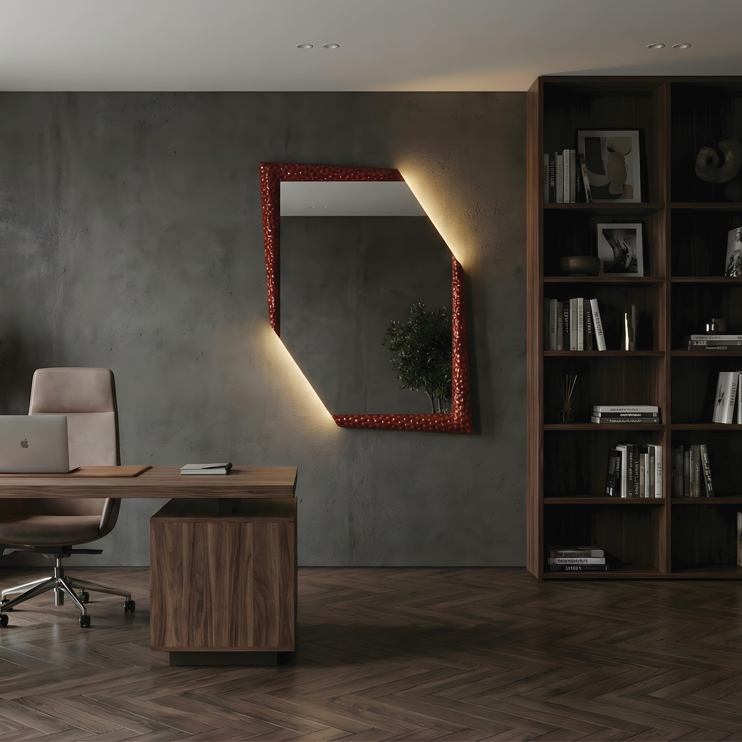 Cometa è uno specchio decorativo che si distingue per la sua forma irregolare e per il carattere scultoreo della sua silhouette. Il design nasce dall’idea di rompere la simmetria tipica degli specchi tradizionali per creare una presenza visiva dinamica e contemporanea. Il taglio inclinato della struttura genera una geometria inaspettata che dona movimento alla superficie riflettente.  La cornice materica accentua il contrasto tra la superficie specchiante e la struttura dello specchio, creando un equilibrio tra materia, luce e riflesso.