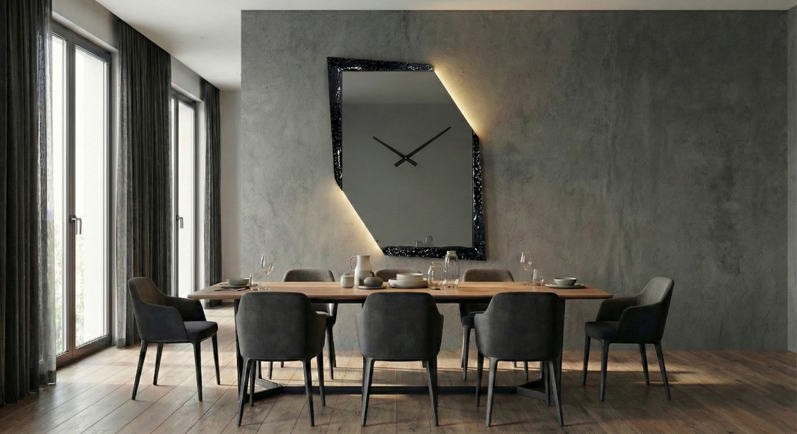 L’orologio specchio asimmetrico Cometa nasce dall’idea di superare le forme tradizionali degli specchi decorativi. Il modello integra l’orologio, con lancette personalizzabili disponibili in tre varianti colore e che mantengono la pulizia estetica del progetto senza interferire con il disegno geometrico dello specchio. Personalizzabili sono anche la finitura dello specchio e quella della cornice, permettendo di adattare lo specchio alla stanza. Grazie alla sua presenza scultorea, Cometa diventa un punto focale naturale all’interno dell’ambiente, capace di trasformare una parete neutra in una superficie visivamente interessante.