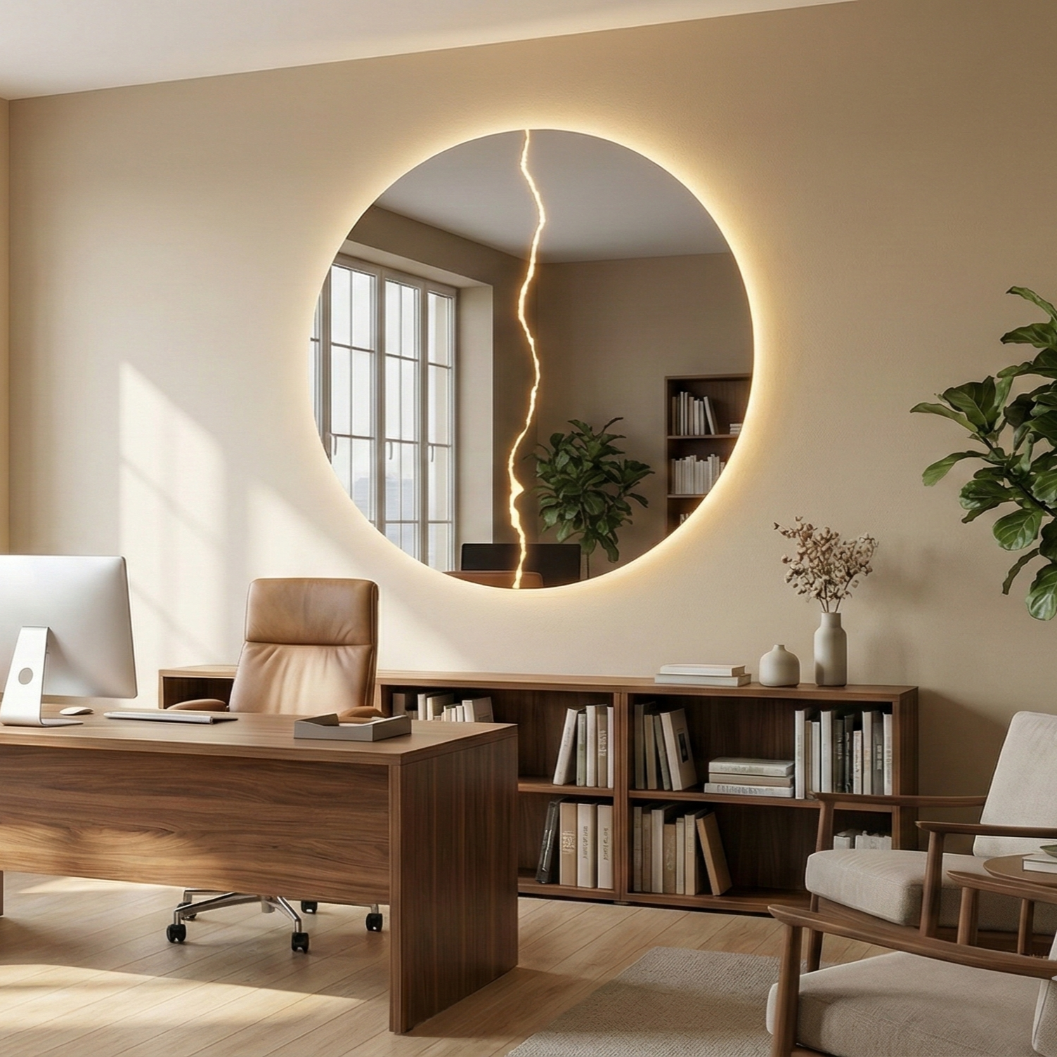 La variante tonda dello specchio Fulmine è un’opera armoniosa di design. Il taglio luminoso centrale rompe la perfezione geometrica con un fulmine retroilluminato. Questo dettaglio luminoso diventa il cuore del progetto: una linea irregolare che attraversa lo specchio come una scia di luce, creando profondità e movimento sulla superficie riflettente. La forma rotonda rende Fulmine particolarmente versatile: lo specchio può diventare il punto focale sopra una madia, in un living contemporaneo o all’interno di uno studio elegante. Grazie alla possibilità di personalizzare le finiture della superficie specchiante, il prodotto può essere configurato per integrarsi perfettamente con diversi stili di arredamento.