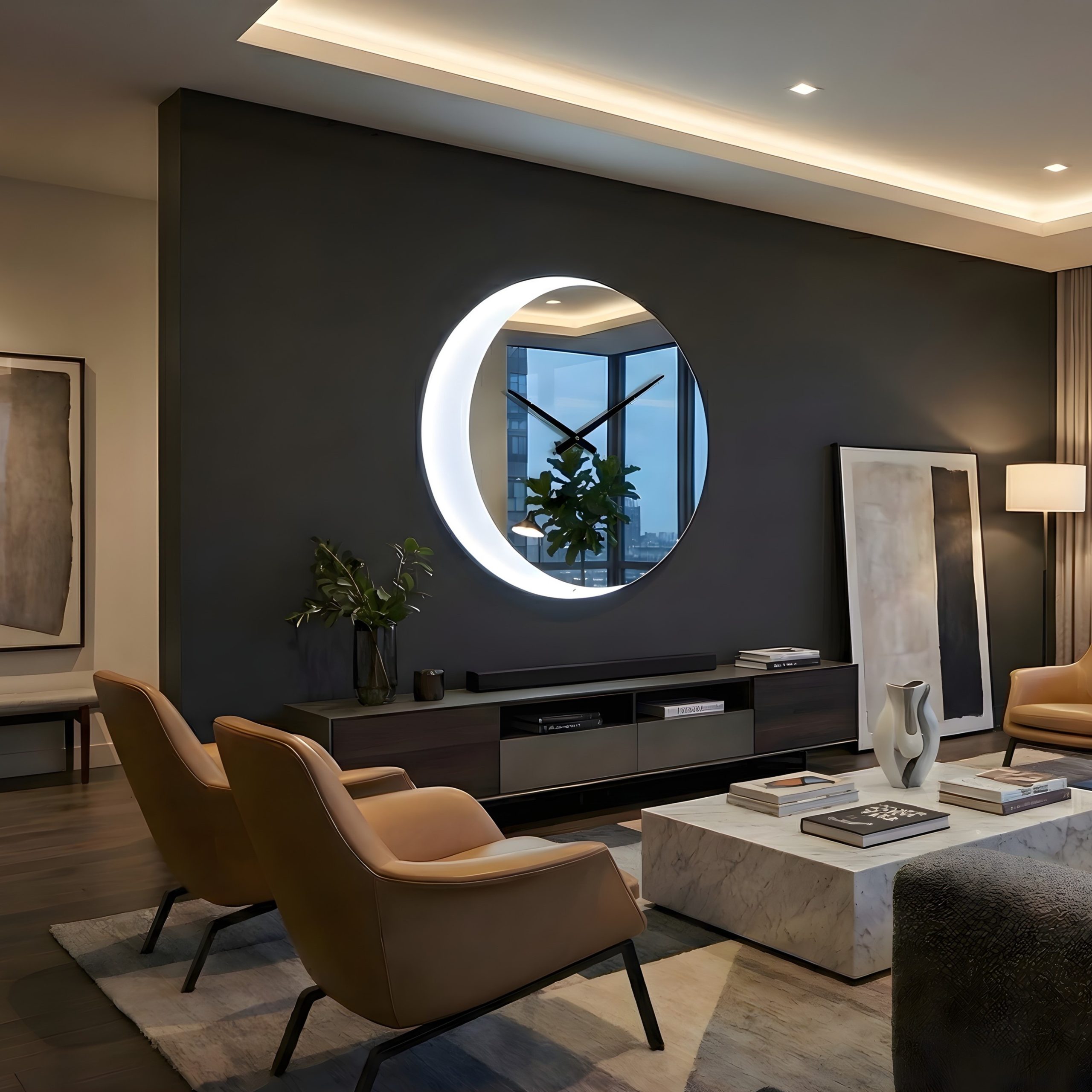 Luna orologio rotondo retroilluminato dalla forma perfettamente circolare richiama l’equilibrio delle geometrie naturali, mentre l’elemento luminoso laterale introduce un segno grafico distintivo. La retroilluminazione LED crea un’aura luminosa che avvolge lo specchio e si diffonde delicatamente sulla parete. Il particolare taglio luminoso a mezzaluna rompe la simmetria del cerchio e genera un effetto visivo elegante che richiama l’immagine della luna nelle sue fasi.